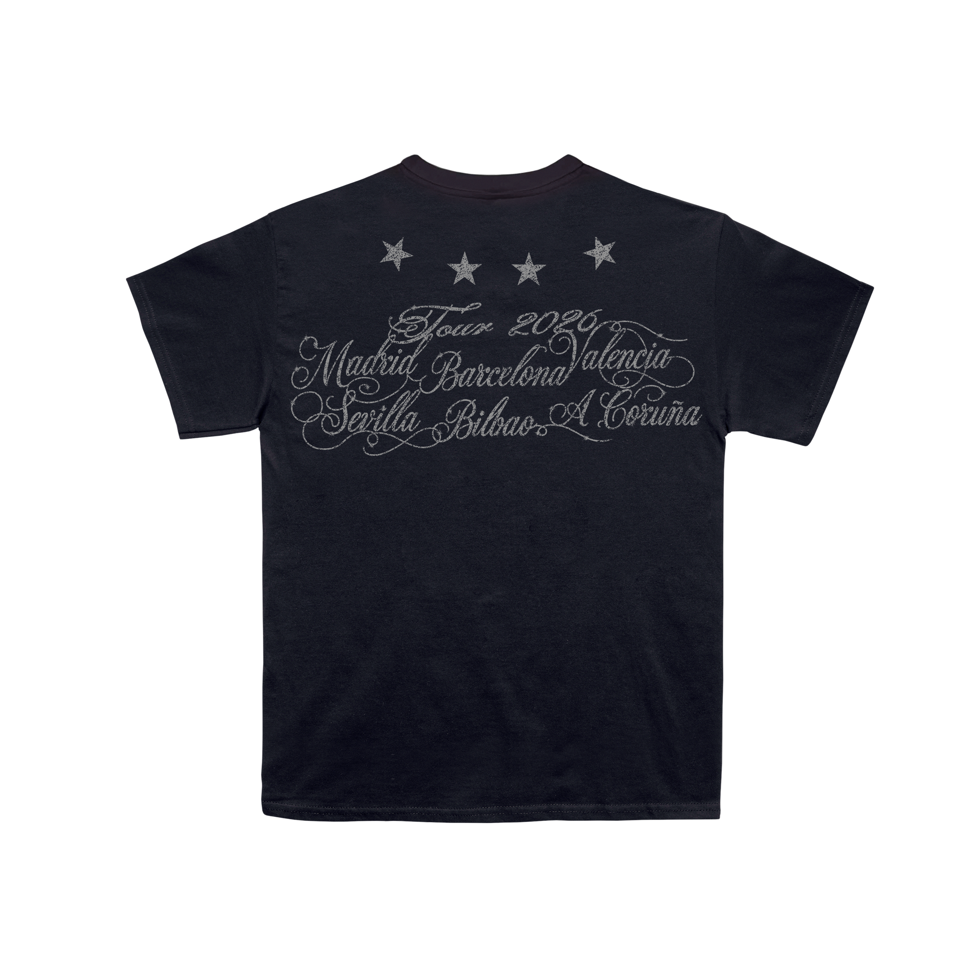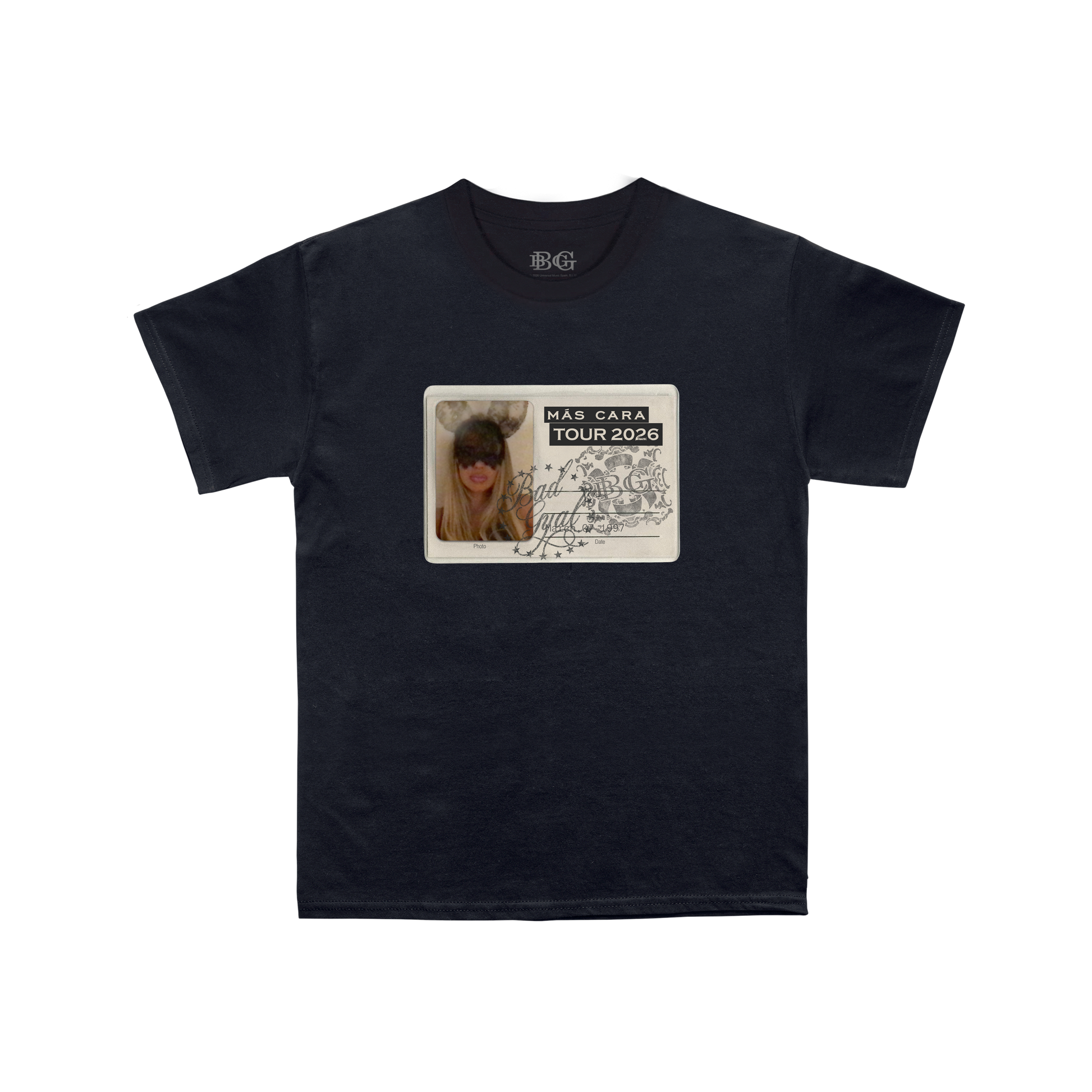 Camiseta oficial del “Más Cara Tour 2026”, con fotografía de Bad Gyal estilo DNI en el frontal, acompañada del nombre del tour y el emblema BG. En la espalda, las ciudades del tour de España coronadas por cuatro estrellas. Una pieza de coleccionista.