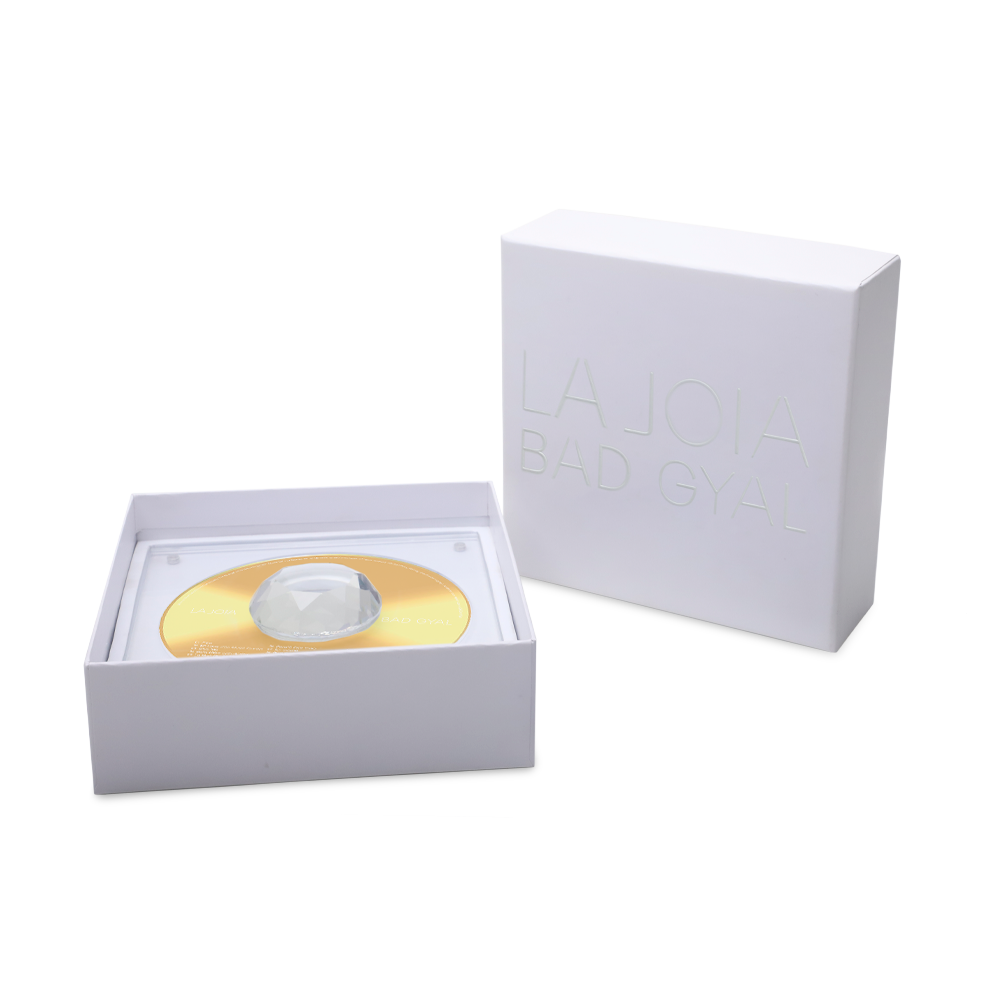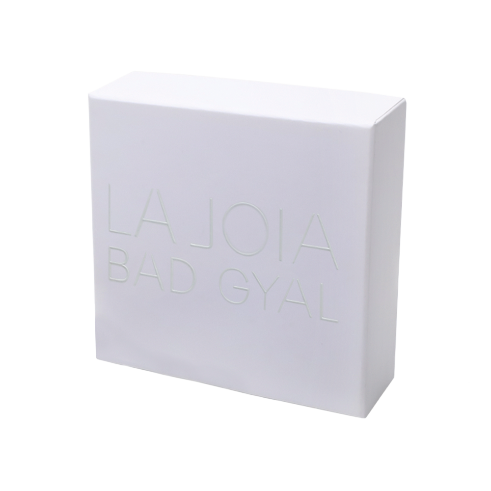 Todo viene dentro de una caja blanca con un golpe en seco en la parte frontal en el que se aprecia LA JOIA BAD GYAL y que servirá para proteger este tesoro.
